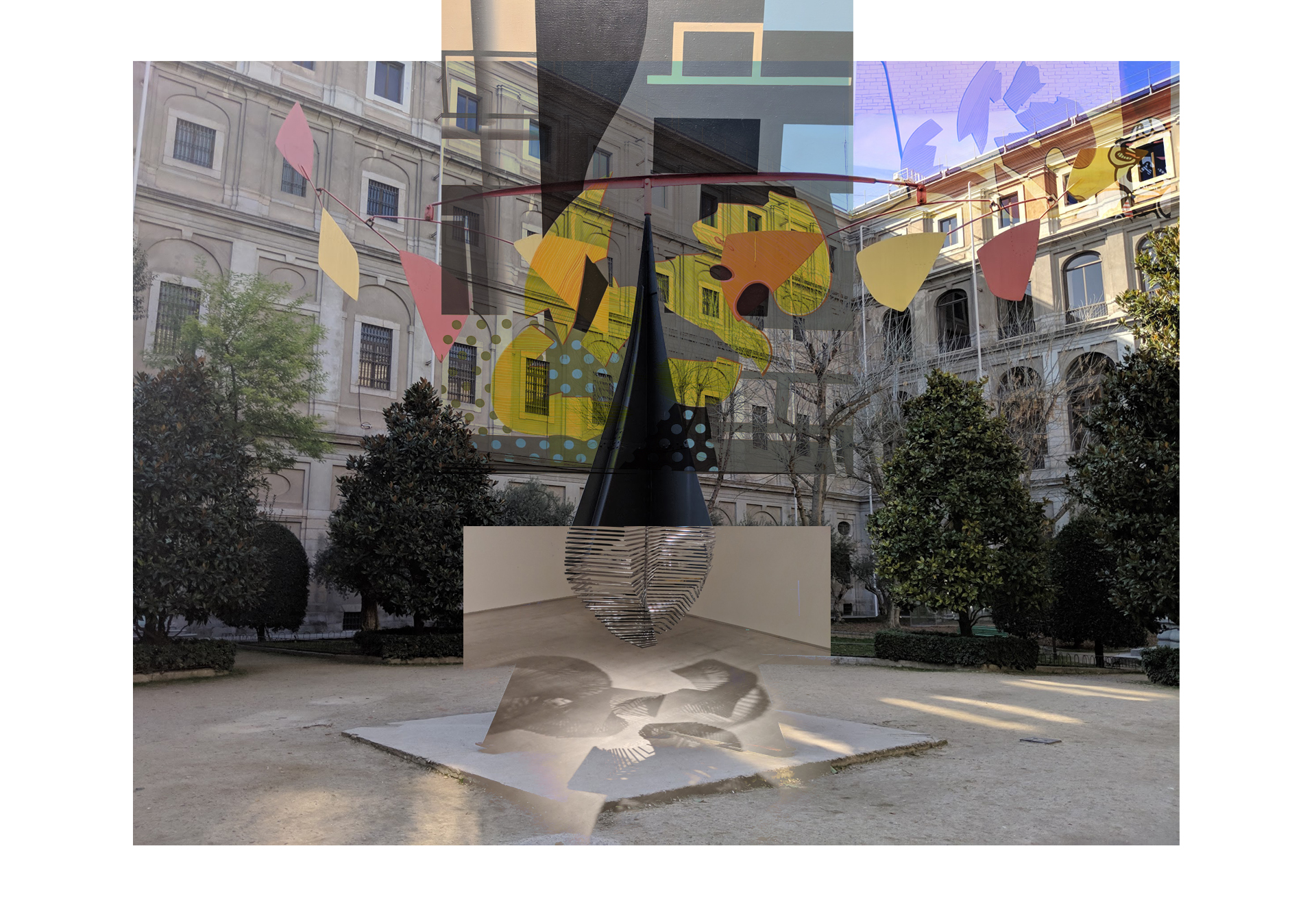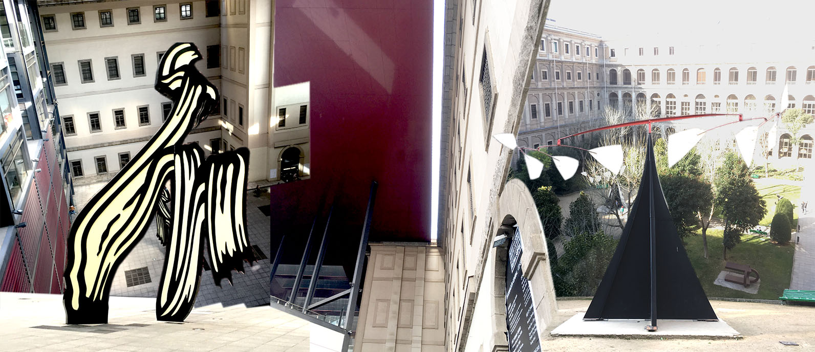 A collage of the two courtyards of the Reina Sofia: the classic building designed by Francisco Sabatini featuring Carmen by Alexander Calder and the contemporary building by Jean Nouvel featuring a Brushstrokes by Roy Lichenstein.
