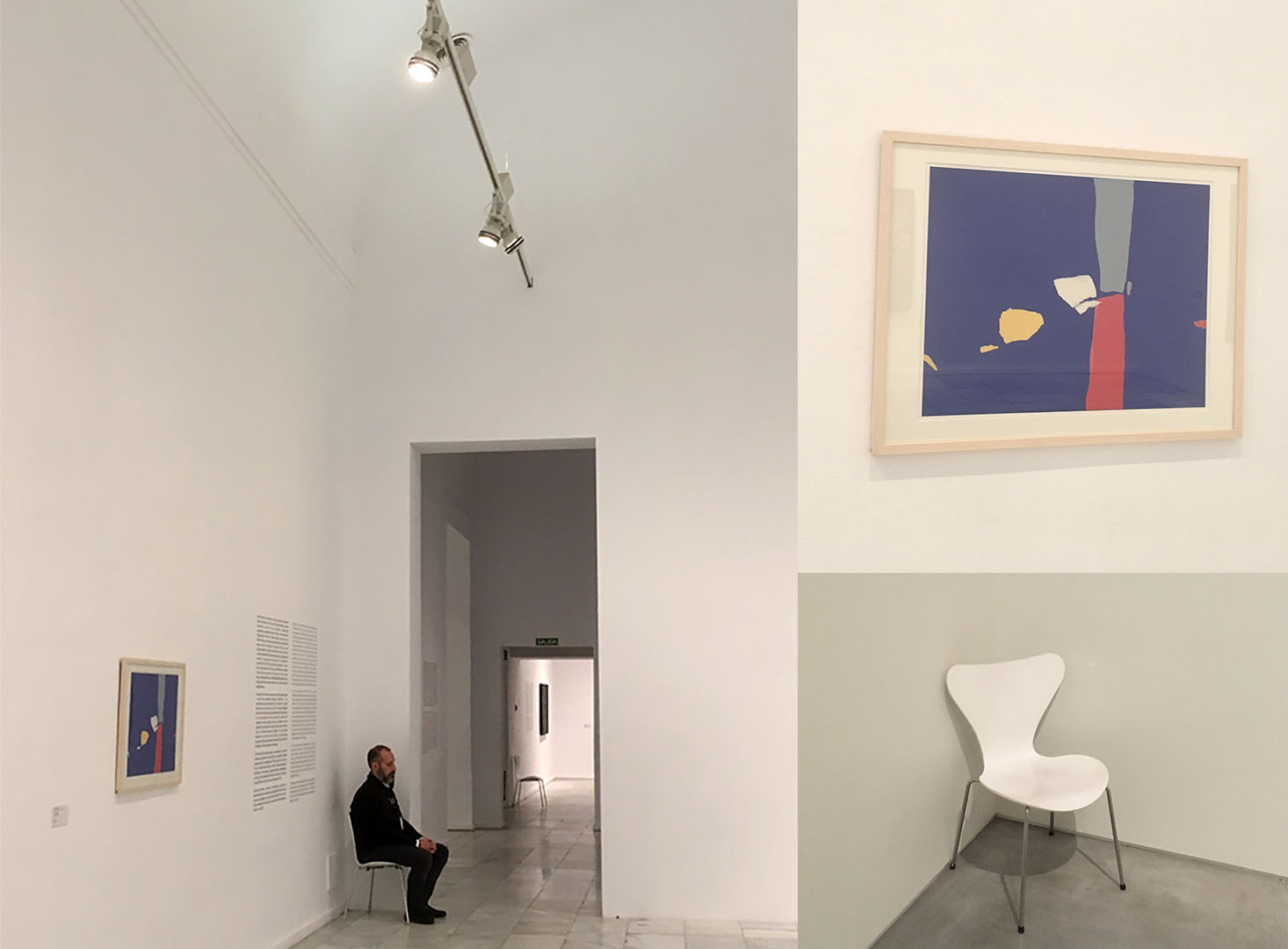 A common site throughout the Reina Sofia: seated security guards. Here the guard is seated near Nicolas de Staël’s Collage on Blue Background.
