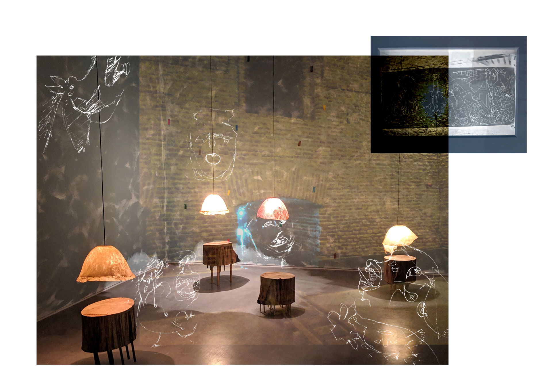 Picture of the museum’s basement as part of the Mápa Teatro exhibition, collaged with sketches of faces from Guernica, a Guernica process sketch by Picasso, and an exhibit in the post-modern collection.