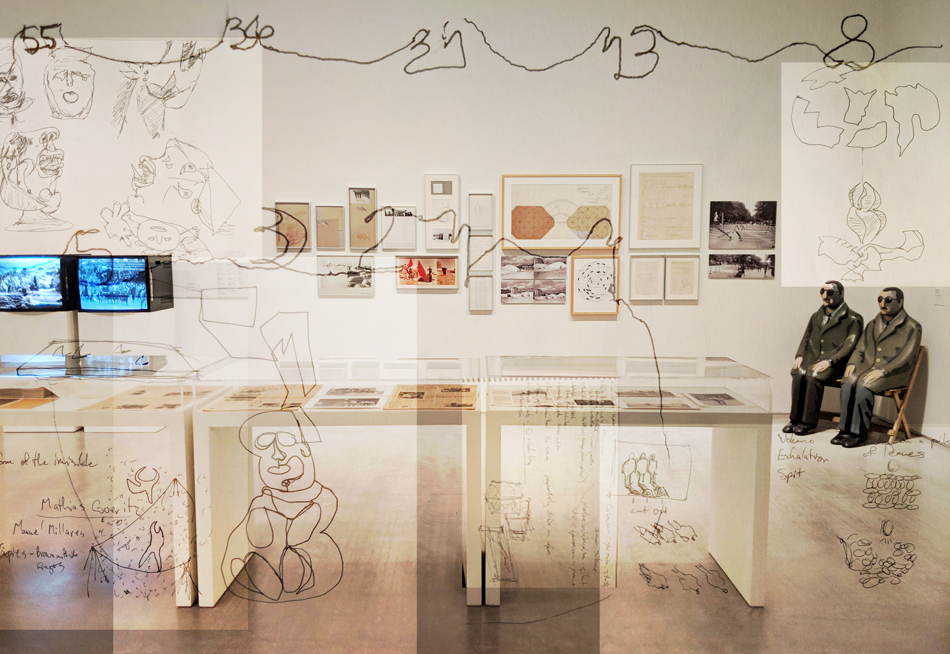A picture of a room in the new museum, collaged with sketches from various exhibits that stood out stylistic examples of expression and examination.