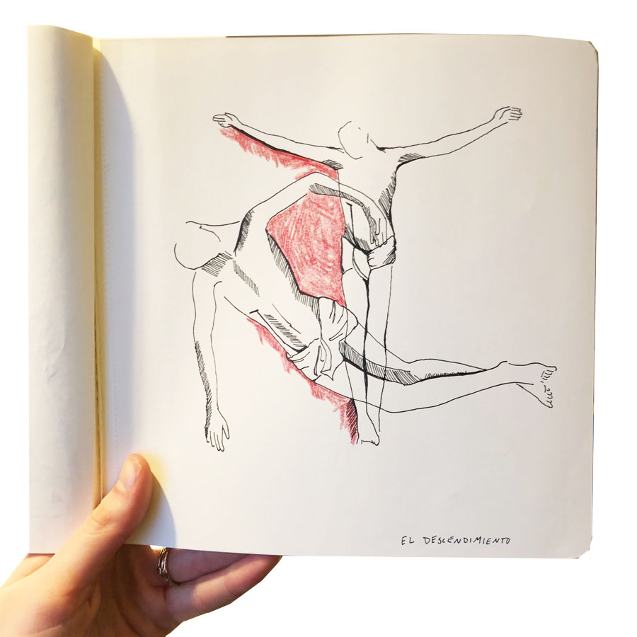 Sketches of paintings by Juan de Flandes and Rogier Van Der Weyden. “The crucifixion” by Juan de Flandes and “The Decent from the Cross” are two of many altarpiece paintings removed from cathedrals or churches for display in the Prado. Both paintings convey deep sadness and suffering at the crucifixion of Christ, evident in the crimson blood, facial expressions, dark clouds, and skulls.