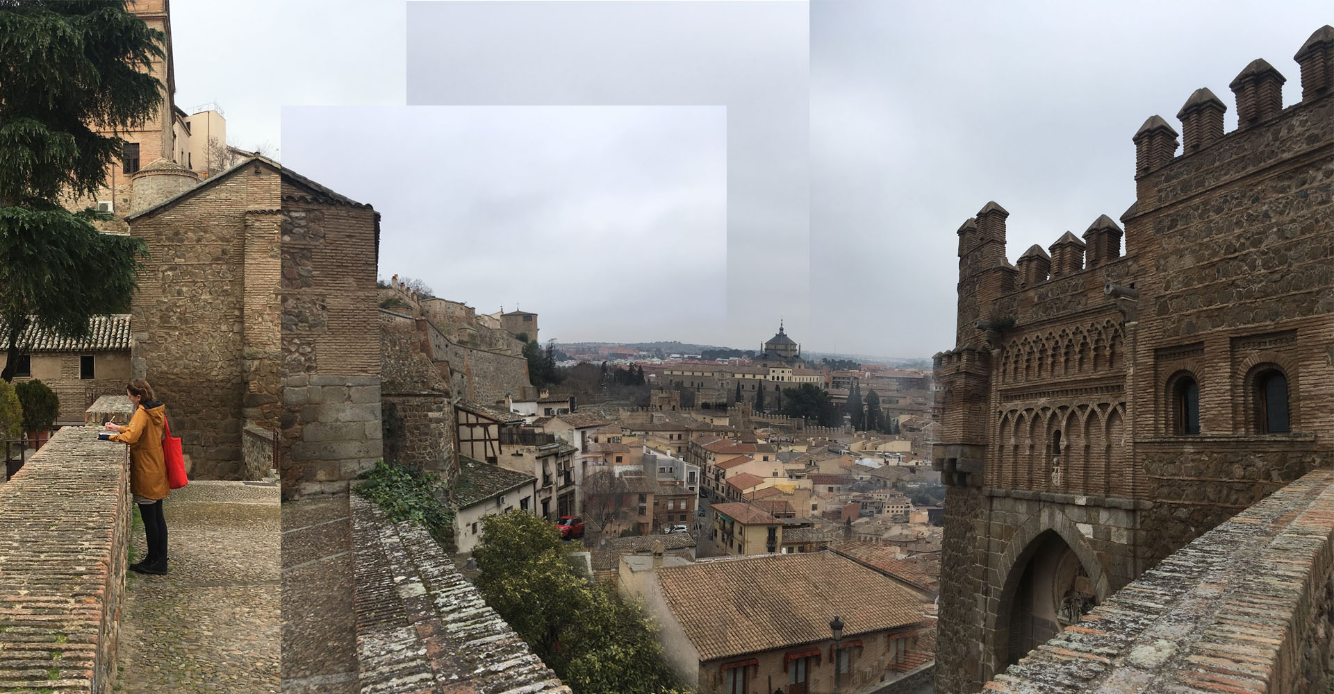 Image collage of view from Mezquita Cristo de la Luz. On the right side is an entrance to the walled city and the left side of the image shows the wall system.