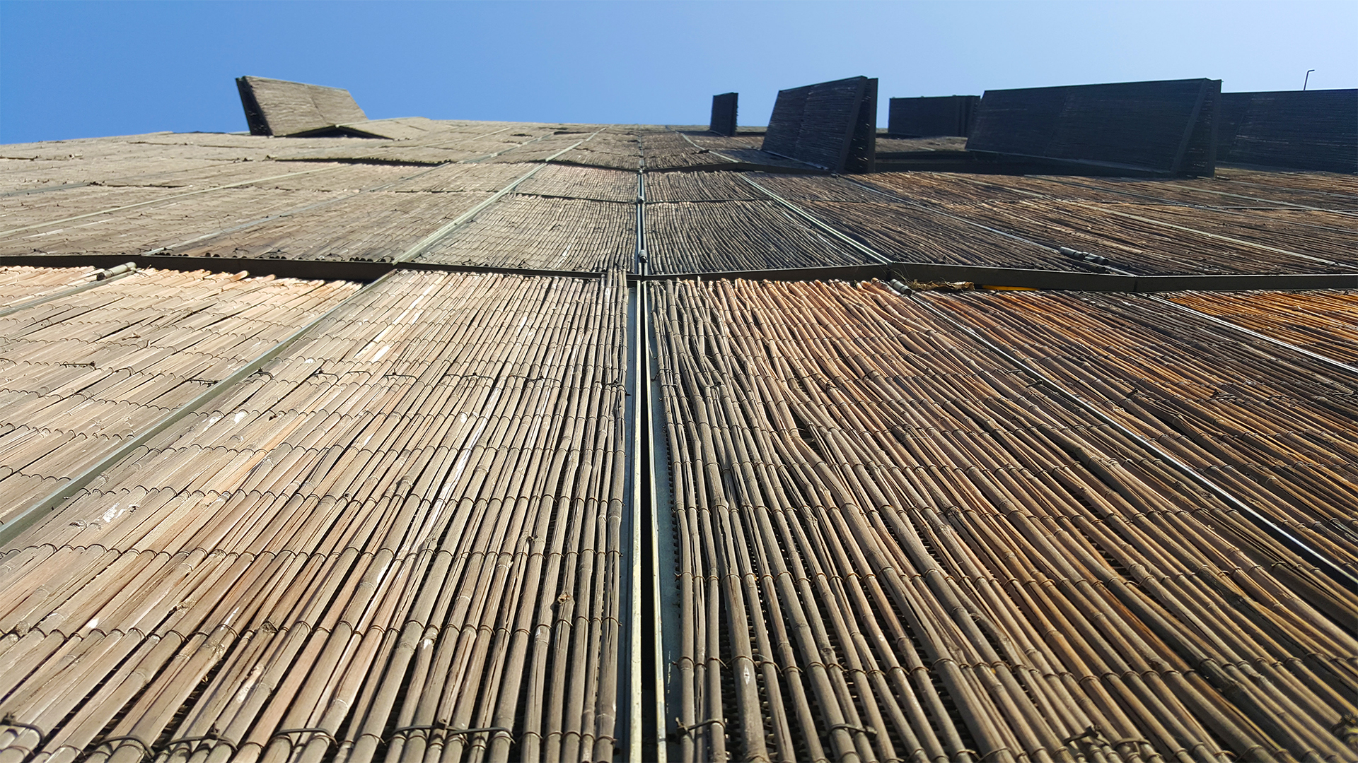 The first building we saw used a wall of banded bamboo to better insulate the building and provide texture.
