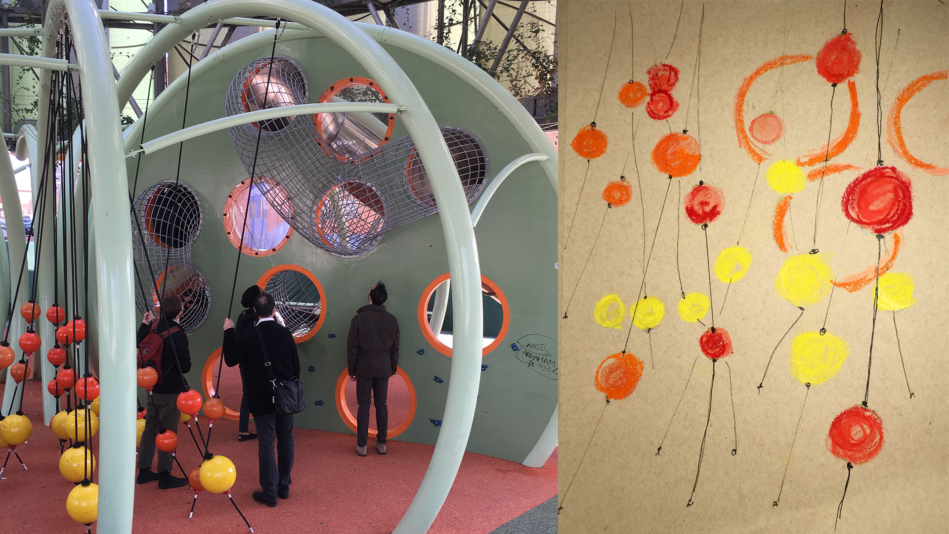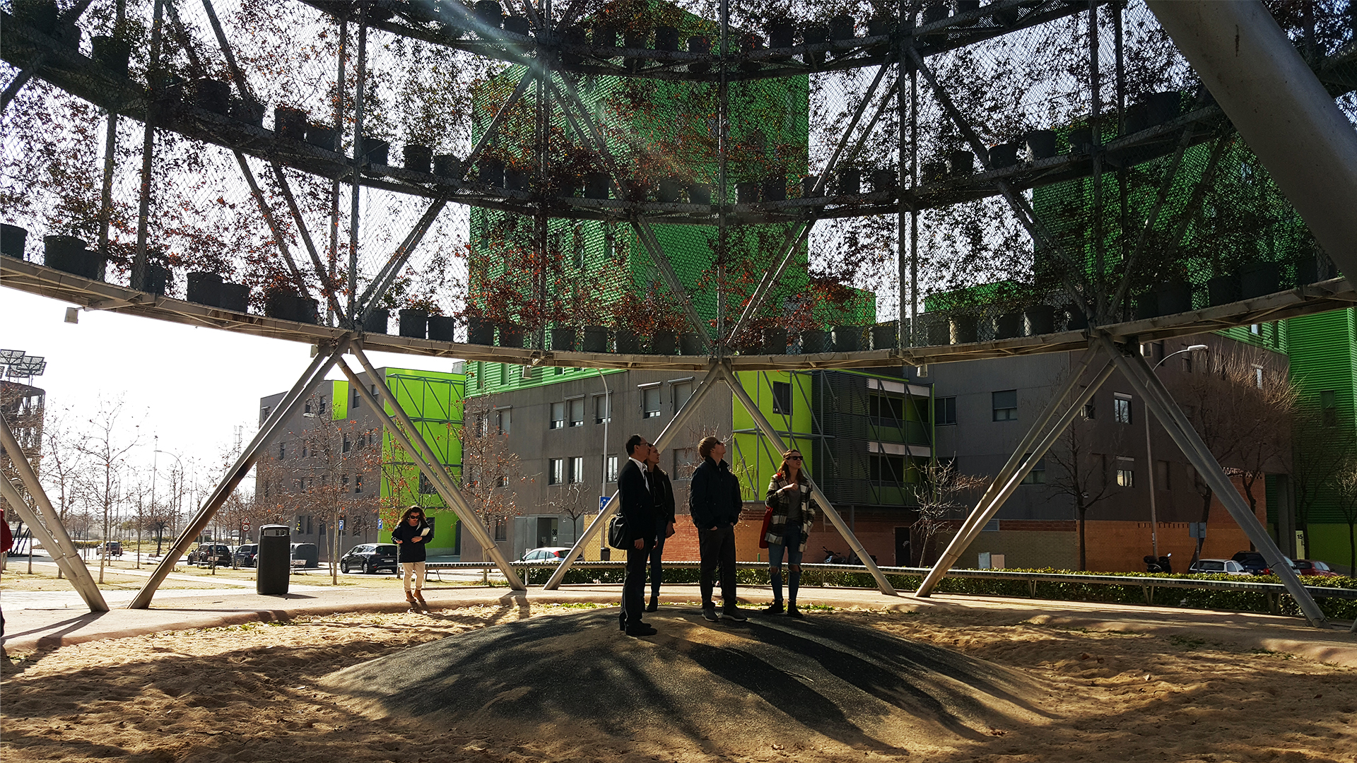 Located on the “Eco-Street” in Vallecas, a park under a giant air filter shelter. Reminded me of our challenge in studio to represent the invisible- air.