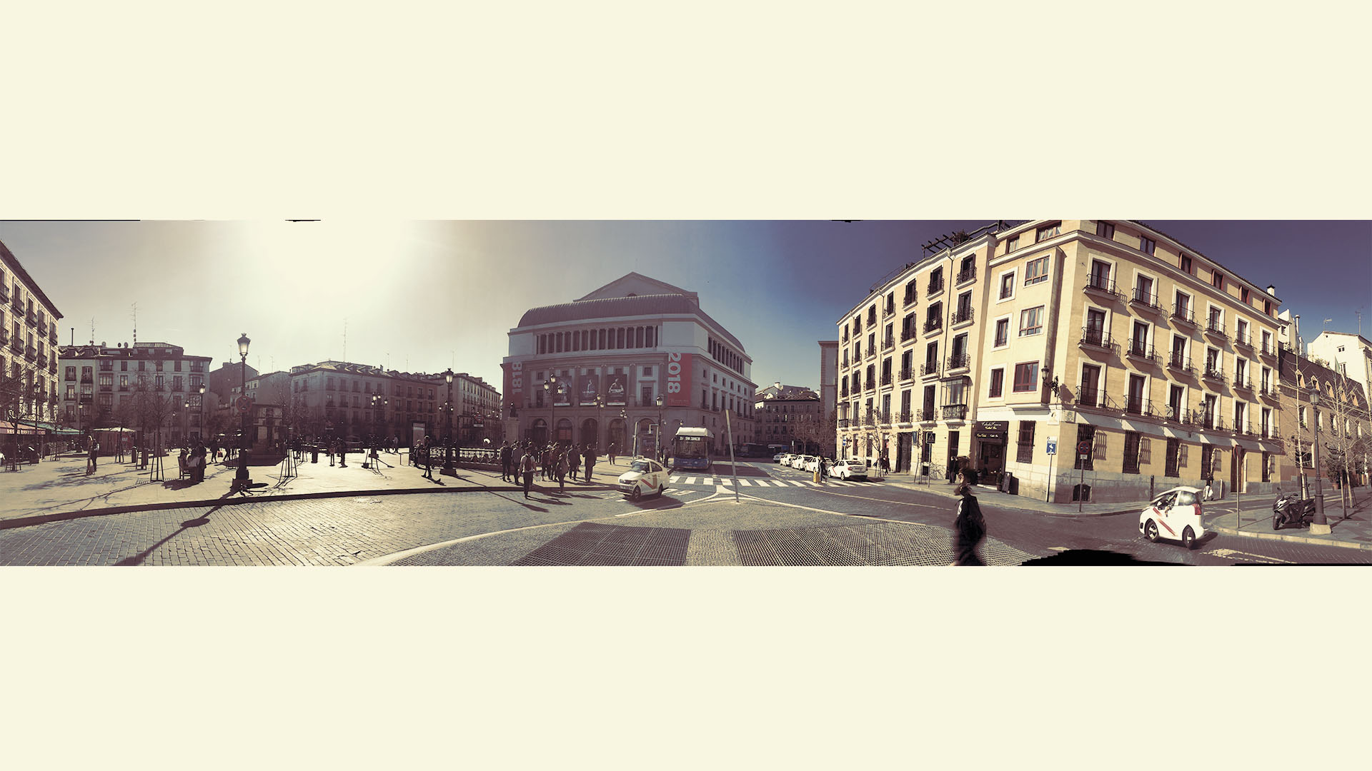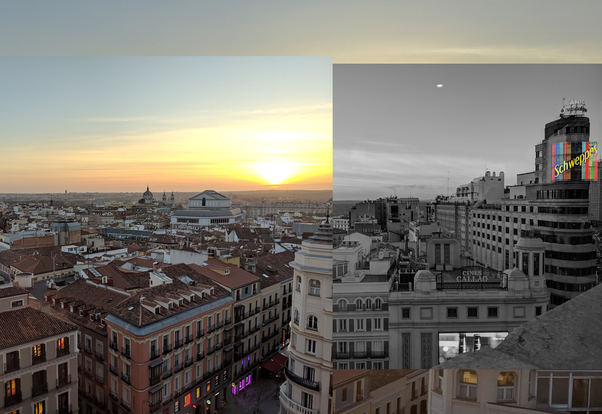A panorama collage of the skyline of Centro, you can see the Madrid’s Opera House, the Teatro Real, as well as the Royal Palace in the background. In the foreground, the historical buildings are juxtaposed with newer architecture built up around the Plaza de Callao, including the iconic Schweppes sign.