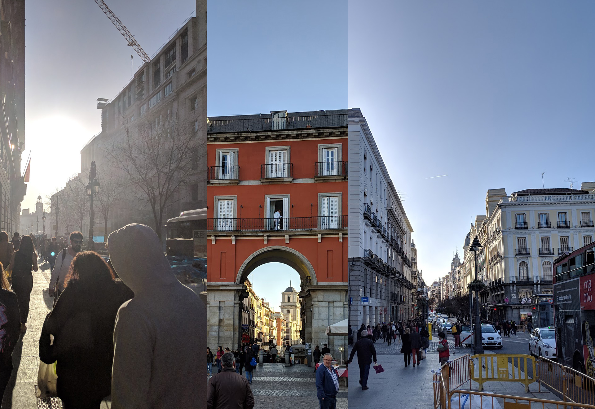On sunny days, those exploring Madrid’s Centro are often gifted with long views down streets lined by buildings that are hundreds of years old. This collage shows some of the conditions that one might see, down long building lined alleys, through Mudejar keyhole shaped entryways, or into the sun, dust, and air pollution.