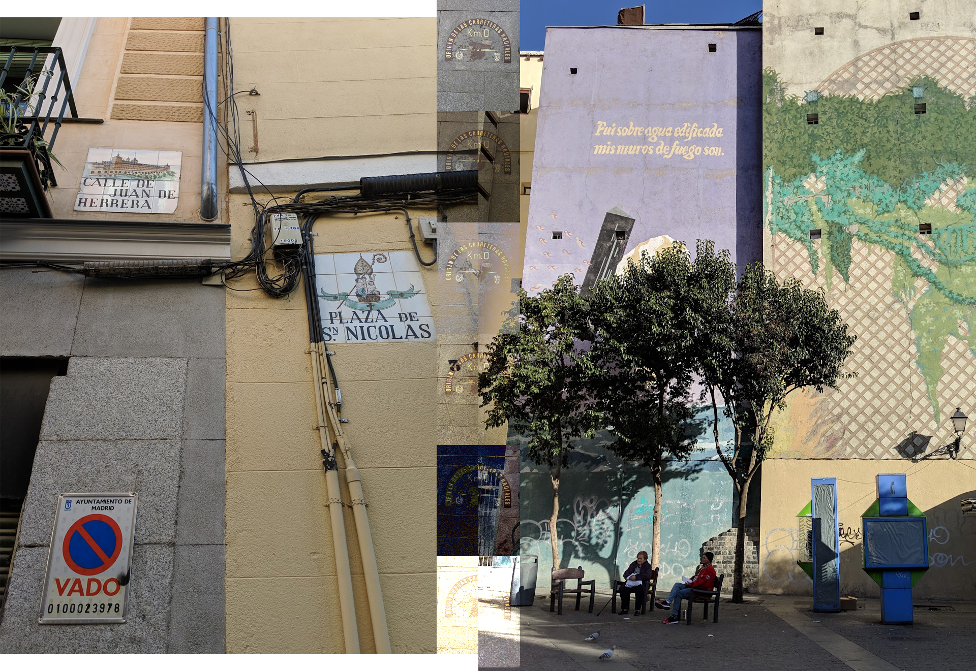 Madrid’s Streets are marked by tiled street signs attached to buildings at the intersections. Some areas of Centro are covered in art and writing, while signage is ubiquitous throughout most of the district. This collage shows street signs, the Km 0 marker that supposedly marks the starting point of all roads in Spain, and street art referencing the historical origins of Madrid.