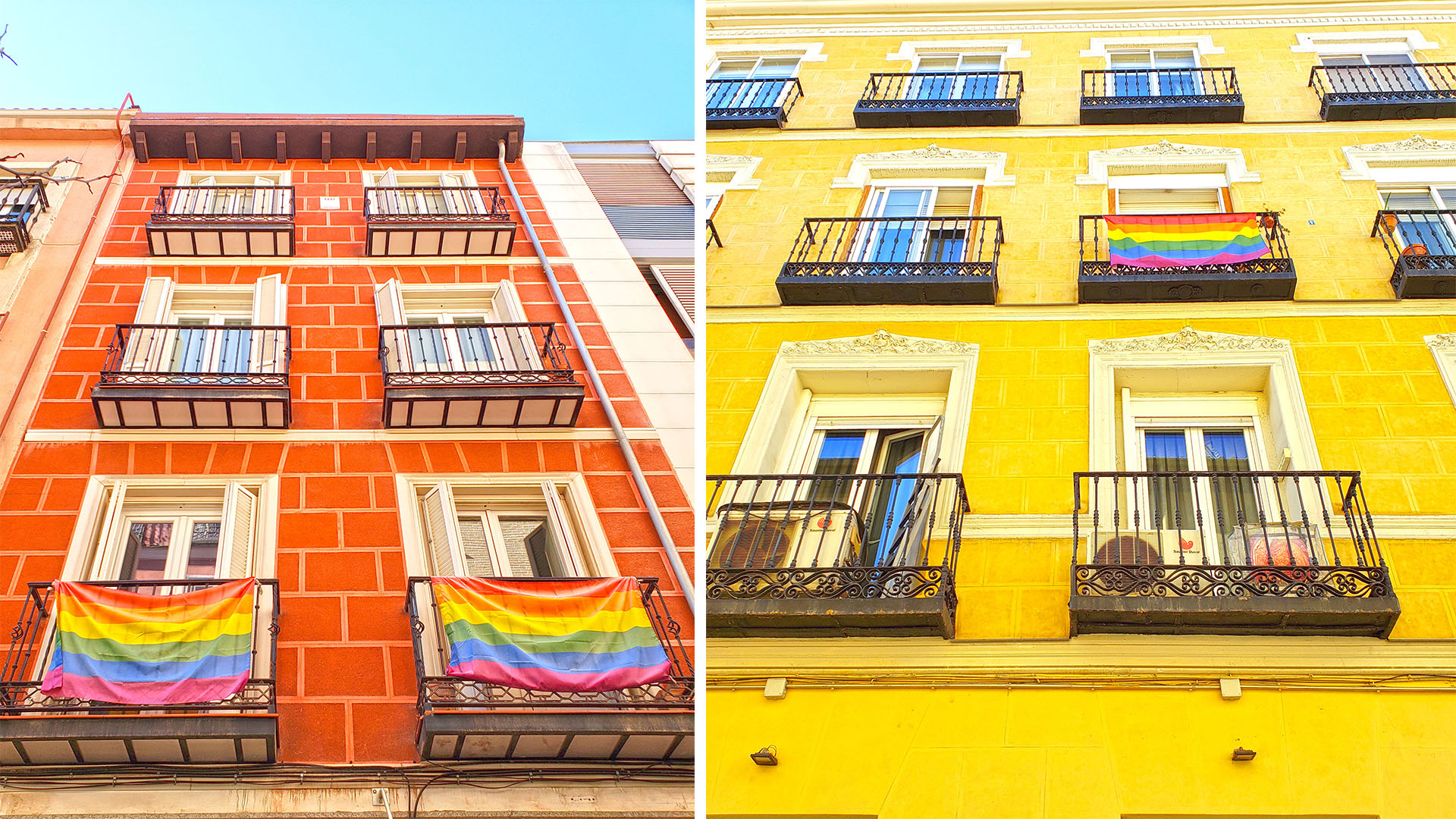 Chueca neighborhood is known as the heart of gay pride in Madrid as seen here with residents displaying their pride flags throughout the streets. It was host to the international gay pride parade roughly two years ago.