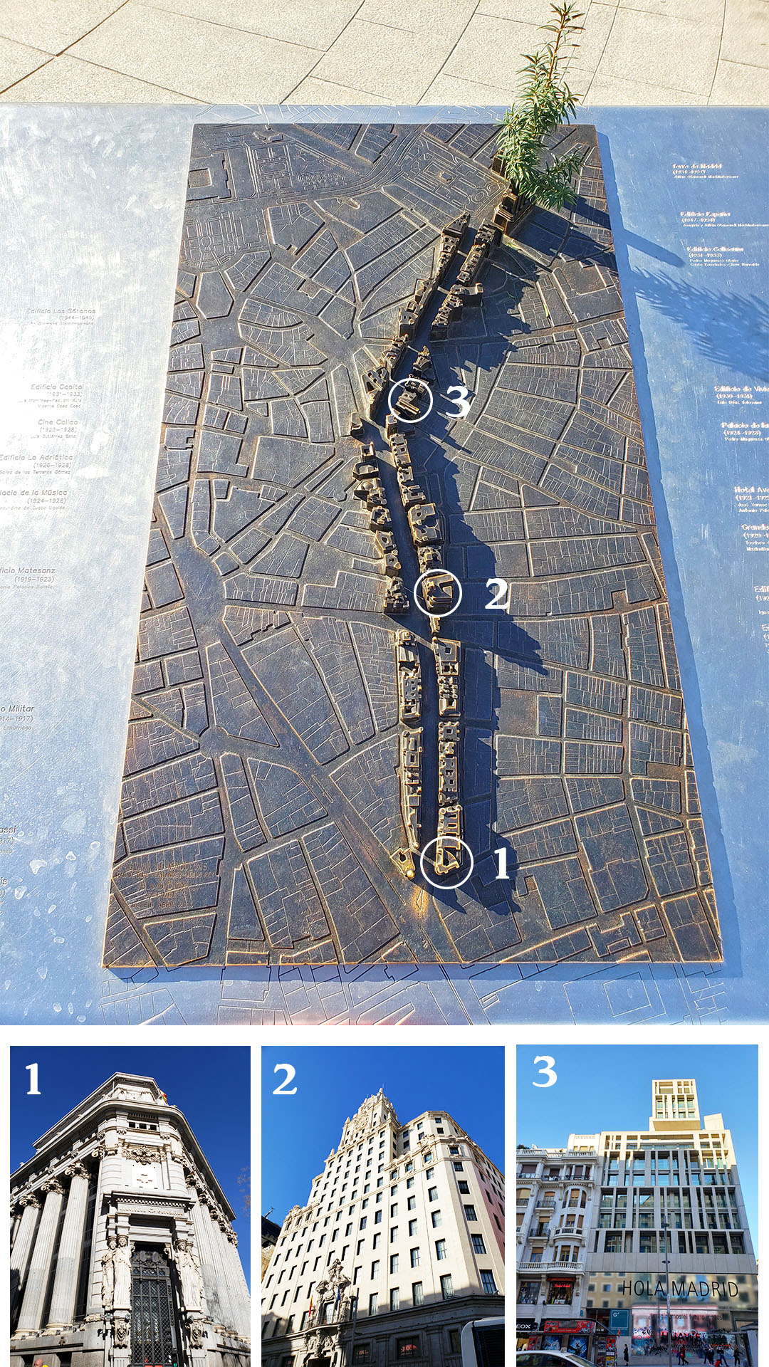 Standing at the beginning of Gran Via, we looked at a small model of the historic street. It shows that the Gran Via is divided into three main sections. The area where we gathered was marked on the model to have been built in the 1920s, with the sections ahead having been built in the following decades. Final constructions were completed in the 1950s.