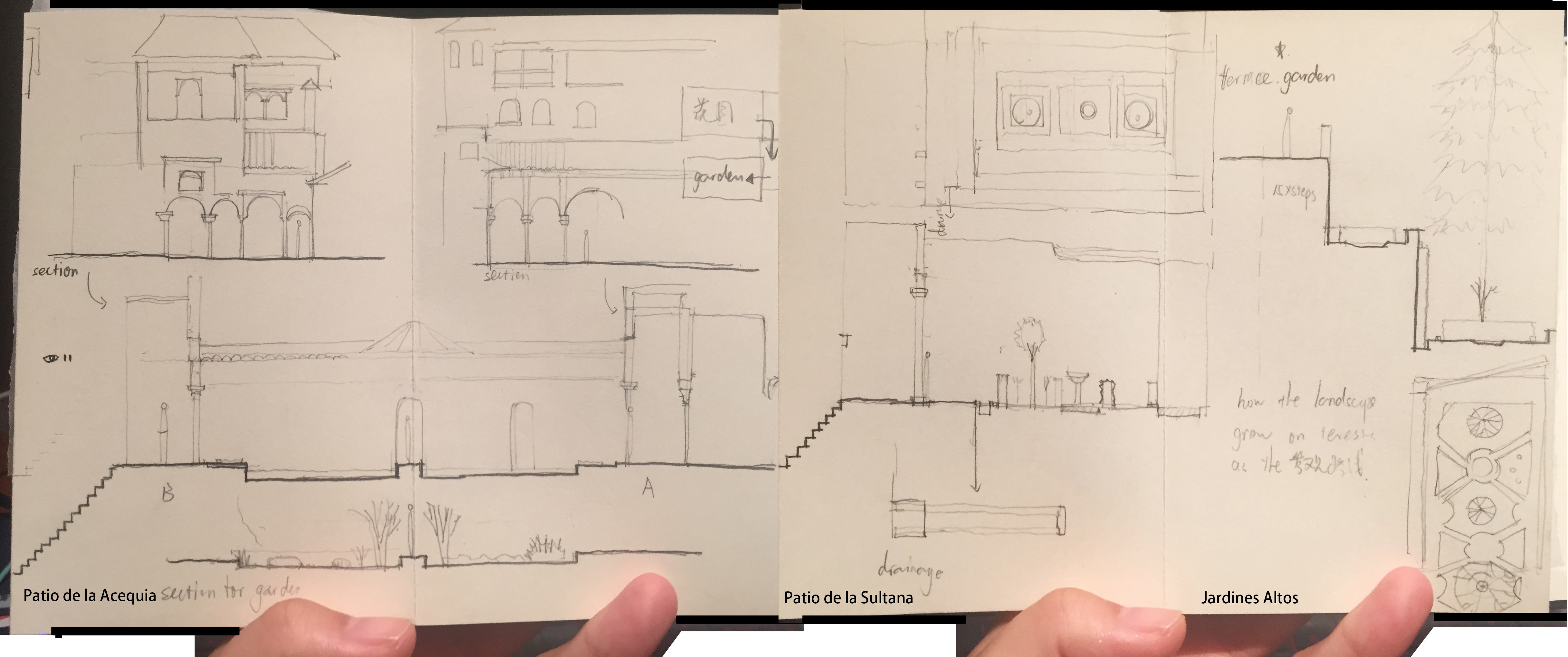 Our group visited the Alhambra again today but roamed around the gardens outside of the walls around a building previously used for recreation and agriculture called Generalife. The area includes the Jardines Bajos, Palacio del Generalife, Patio de la Sultana, Escalera del Agua Mirador Romántico, Patio de la Acequia, Casa de los Amigos and Jardines Altos. The days objective was to draw a series of section cuts through the space at spots that we were drawn to in a Japanese folio. We were exploring space in new ways using the curious methods approach of probing not proving. I was interested in looking at how space is treated at changing elevations, how water traveled through those spaces and what characteristics defined the perception of an area. What stood out to me was the constant sound of water and how it was softened by surrounding vegetation to create a feeling of calm and awareness. Water is the element that slowly guides you through your path and when it is not present, the ground plan is treated in the same manor. The dynamic of the waters sound also fluctuates in volume through the space reminding you of the passing of time. There are several areas where it seems to crescendo including the center fountain of Jardines Bajos, the Patio de la Acequia, the Patio de la Sultana and reaching is climax at the Escalera del Agua (Steps of Water). The landscaping is a very formal affair where control of both vegetation and water is mastered to the point of surrealism. Originally designed as a representation of paradise, these gardens and spaces truly feel part of a world outside our own.