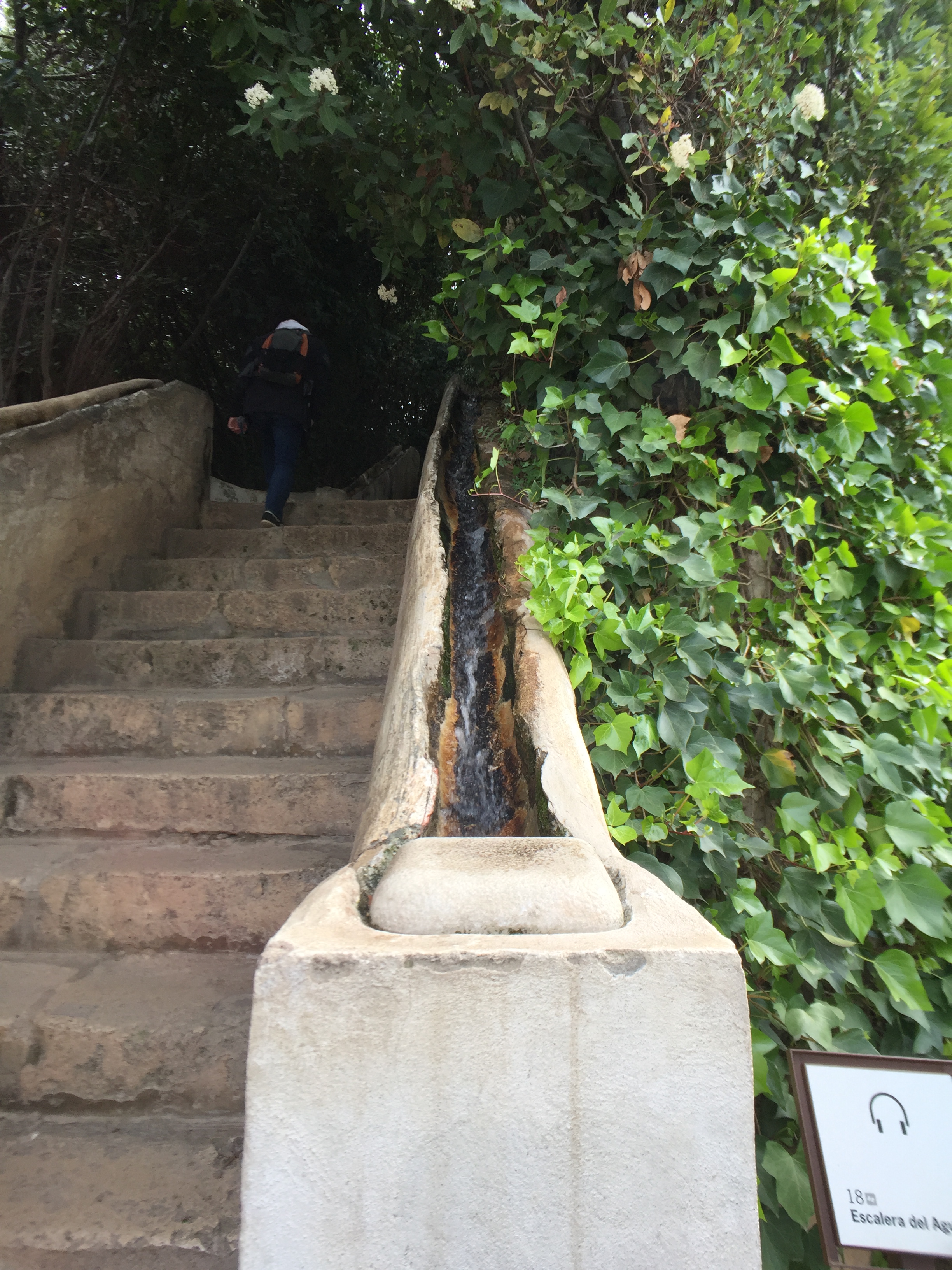I made my way back to the Generalife palace were I stopped for sometime to enjoy the water stairway that leads up to the highest point in Alhambra called Mirador Romantico or Romantic observation point. The water stairway had water runnels along the stairs were you would put a handrail. The stairs were surrounded by dense shrubbery that provided ample amount of shade. Along with the movement of water these stairs provided a cool retreat.
