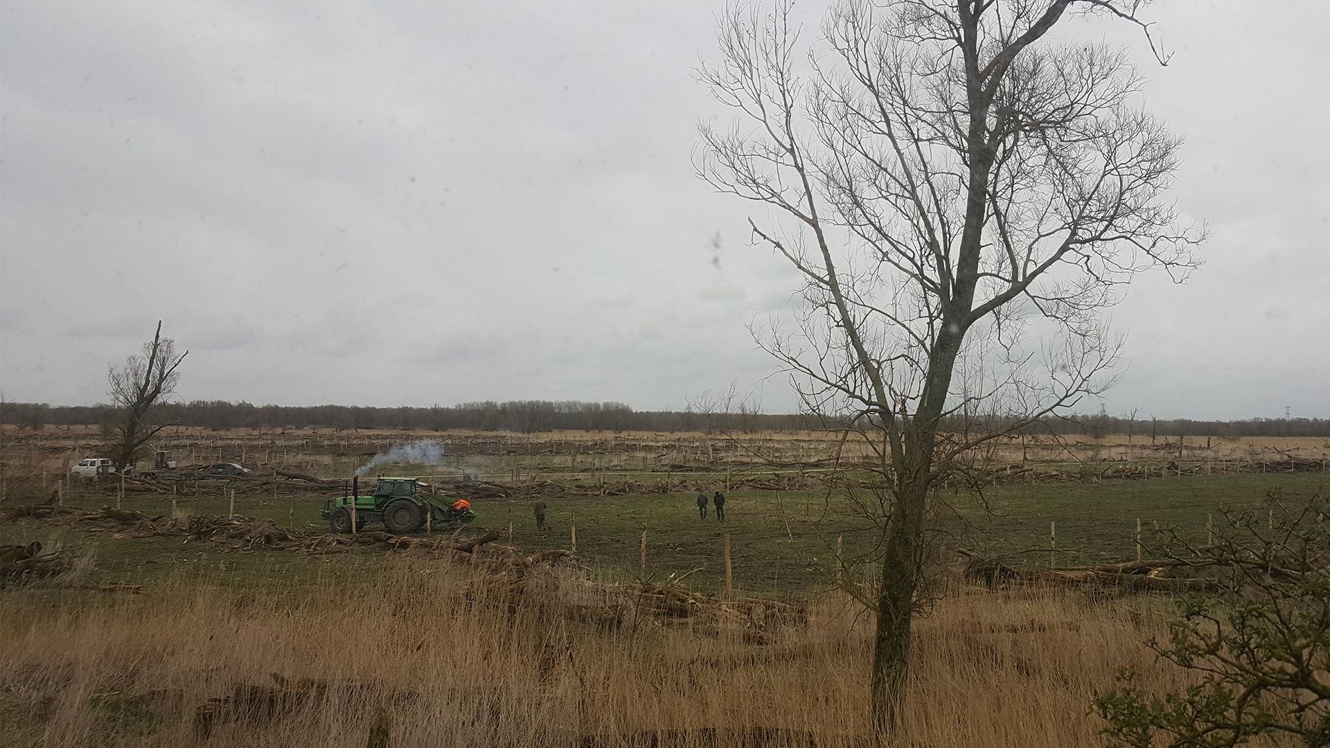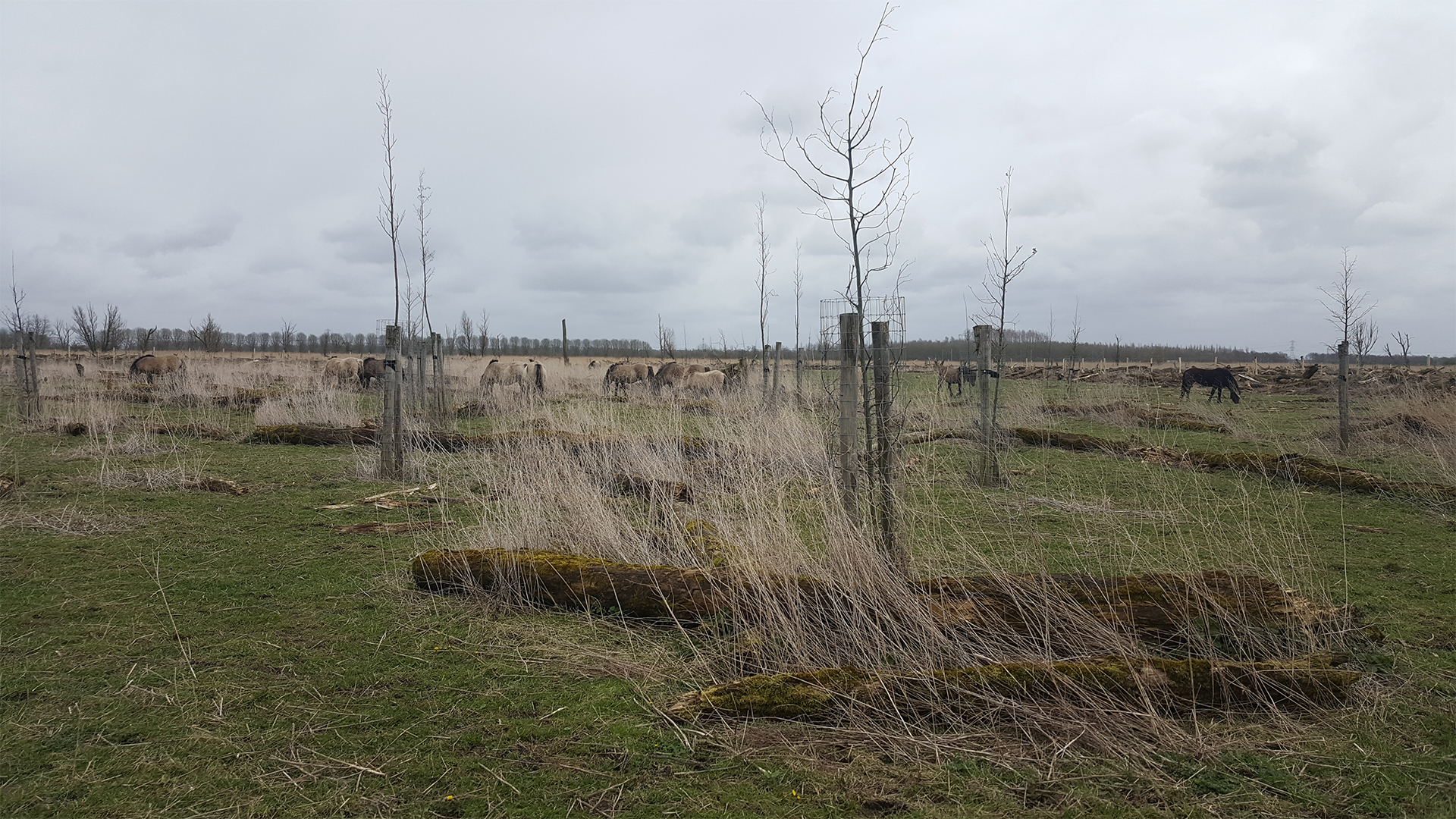 inside the recreational grazing area of the Oostvaardersplassen Lelystad section. Facing the newly planted trees reenforced with fencing to protect from grazing horses.