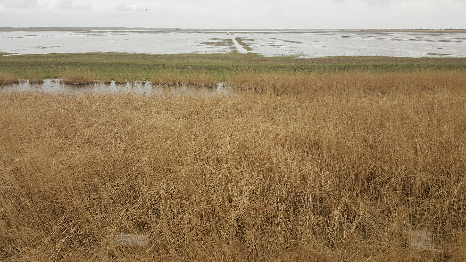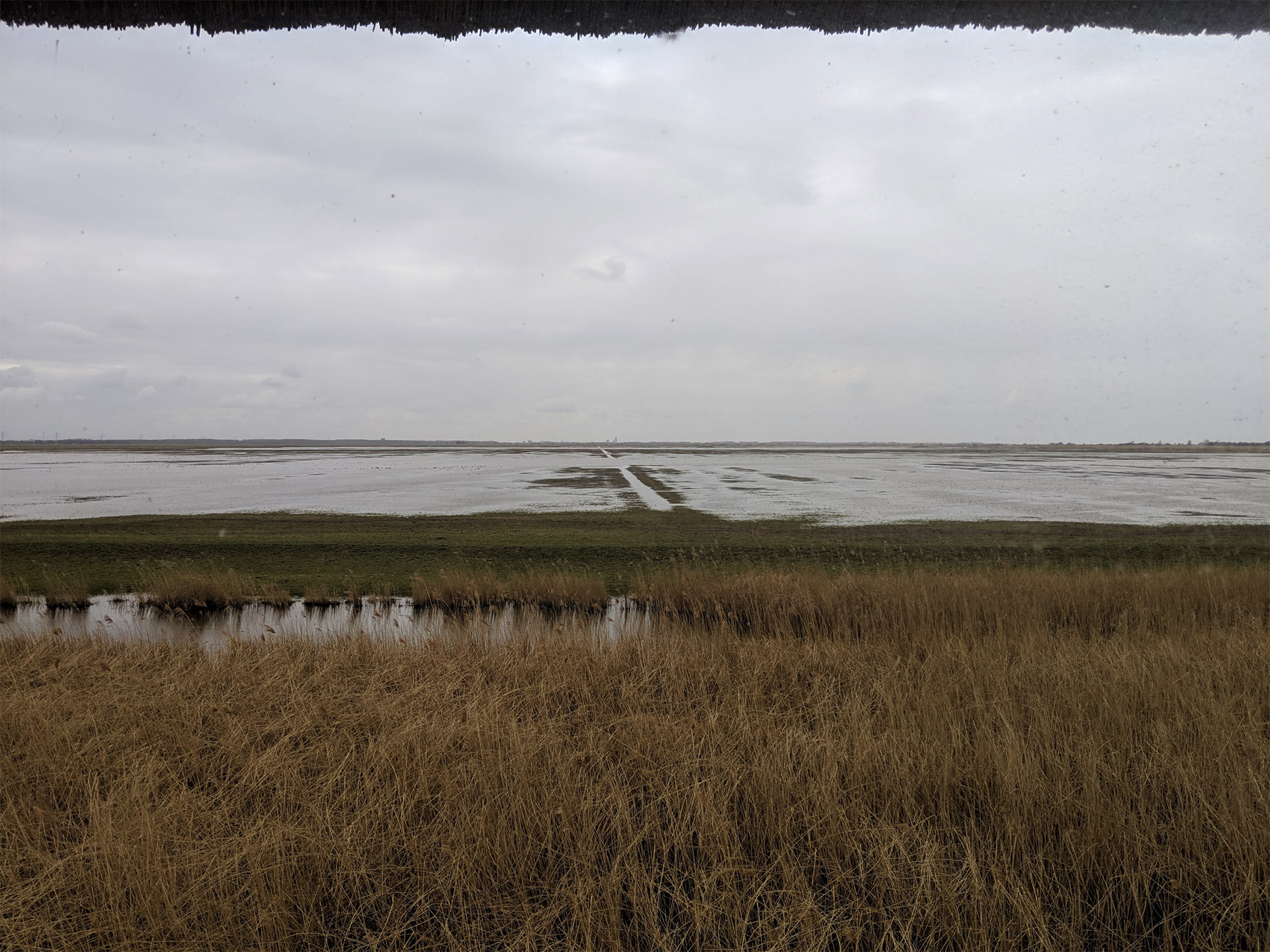 The scene looking through glass at the lookout tower located in Oostvaardersplassen Lelystad section facing towards the Lelystad visitor center. The image includes the efforts of the park to revegetate select patches that will be fenced off from most grazers, but perhaps not the red deer who can jump up to 8 feet in height and are known to be good swimmers.