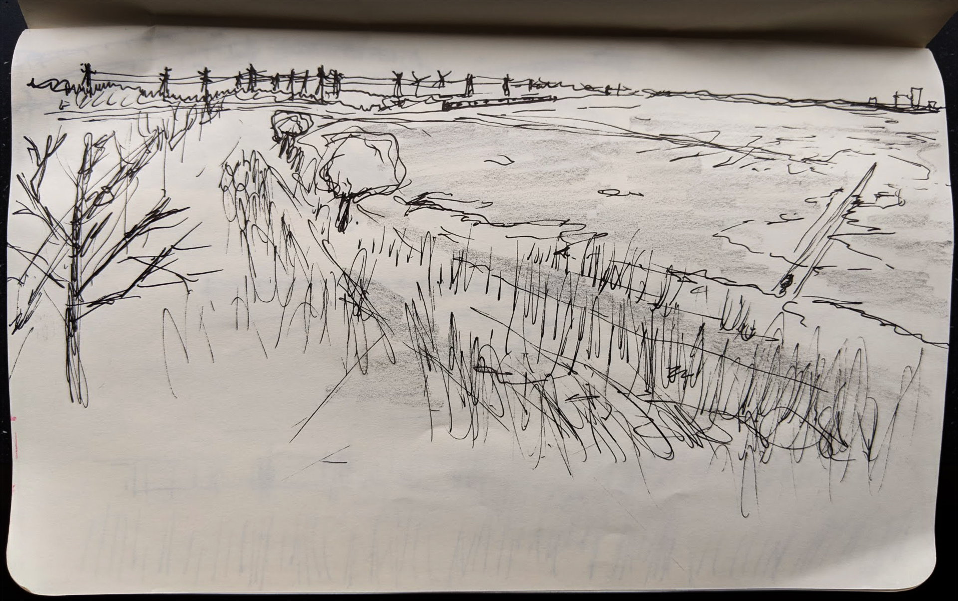 A sketch of the horizon from the same bird blind. To the left side there are train tracks, utility lines, and windmills leading to the few buildings popping above the tree line. To the right, only trees.