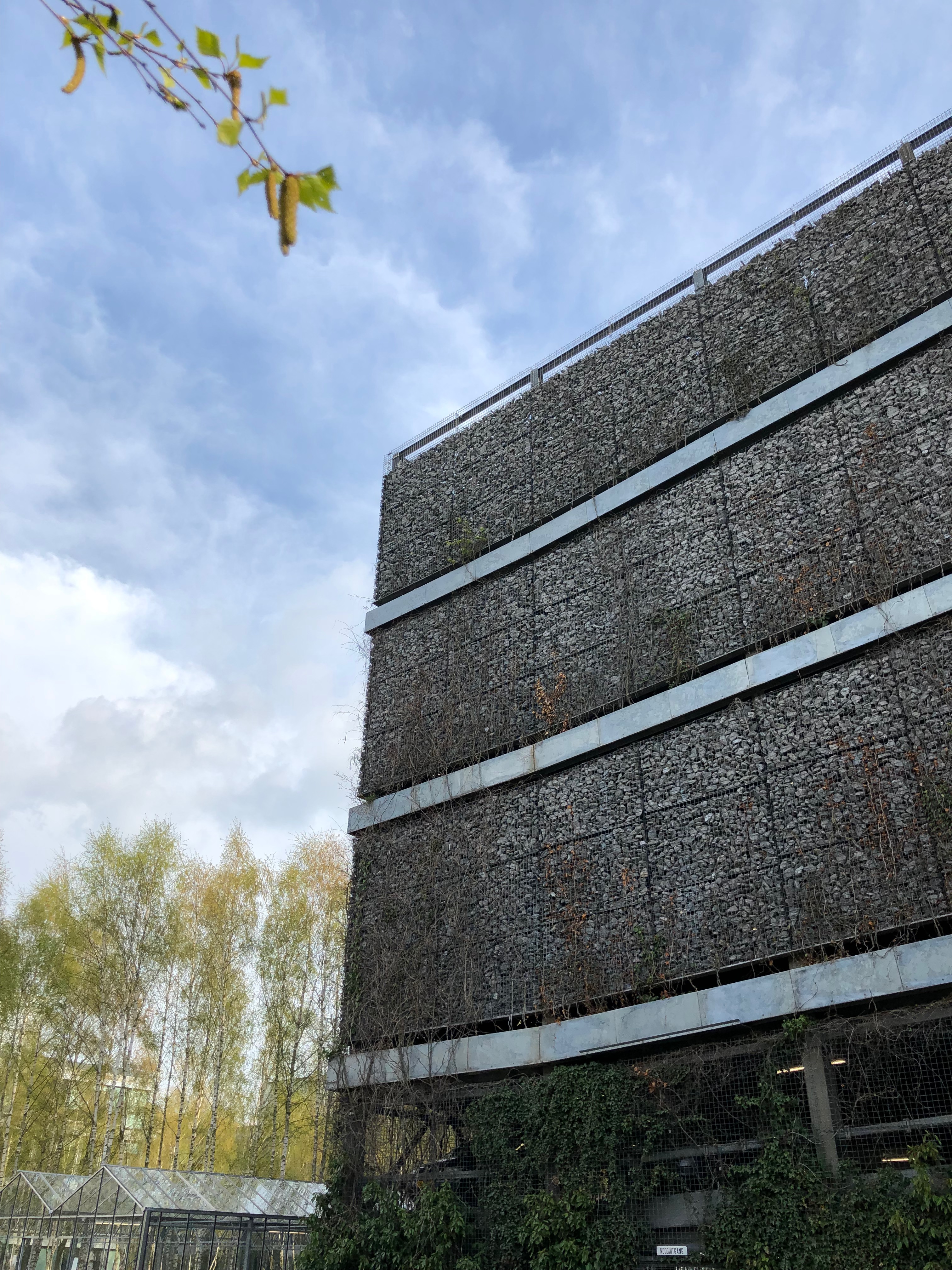Compact parking garages on the High Tech campus. The parking garages are covered in vines to fit with the green surroundings.