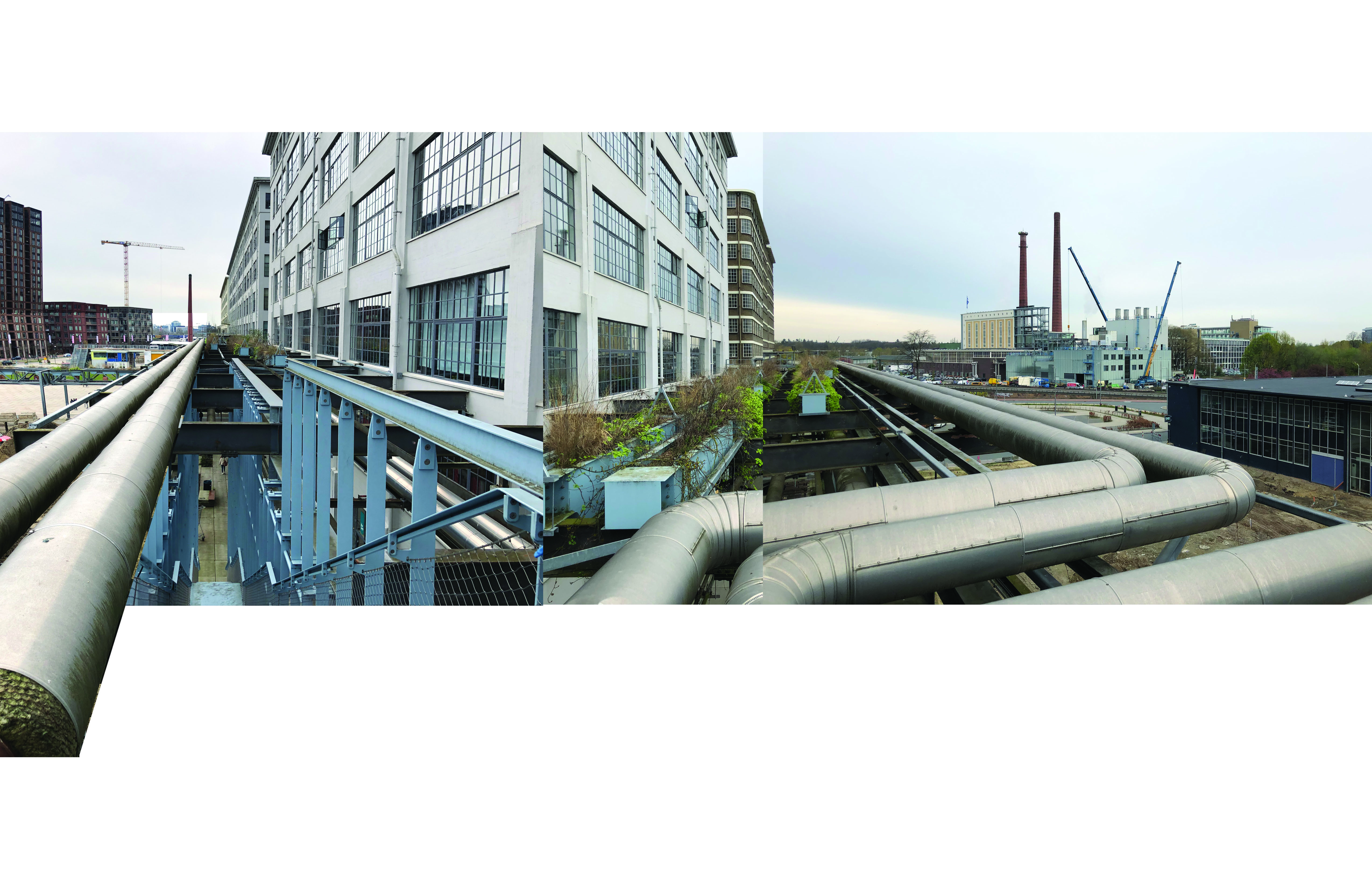 Preservation and redevelopment of Strijp S industrial buildings. The revitalization includes an elevated path and lookout points, retrofitted infrastructure used as planting beds, and mixed use shopping, office space, and residential.