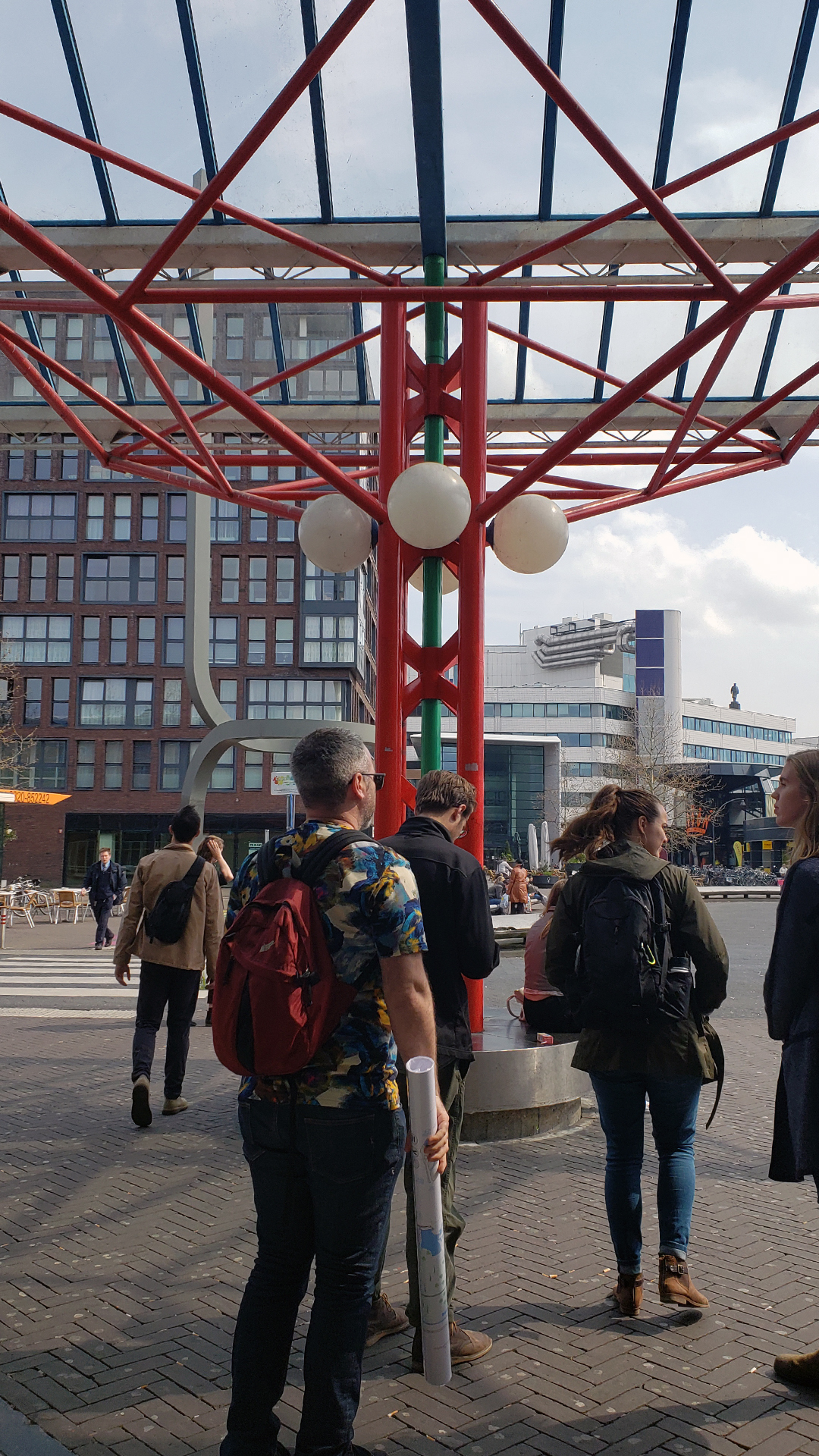Group waiting for the bus outside the Lelystad Station before the final project presentation. This train station has a colorful red support structure system making it one of the most unique stations in the area.
